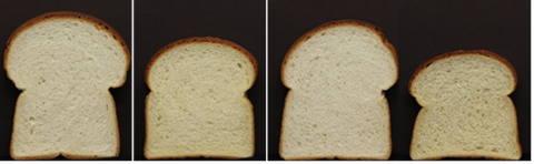 Breads made with 20% pre-treated chickpea flours (L to R: Untreated, Roasted, Germinated, Micronized).
