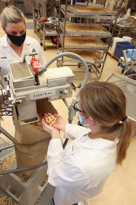 Kasia McMillin and Lindsey Boyd assess pulse extruded snack quality during processing